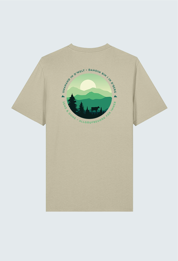 Dekoratives Lieblingsshirt mit schöner Allgäu-Grafik und Spruch "Umanand in d'Welt - Dahoim in d'Berg - Allgäufreunde für immer". Dieses Shirt aus hochwertiger Bio-Baumwolle begleitet dich überallhin und zeigt deine Verbundenheit mit dem Allgäu. Mit SENZ&DONE mach‘sch a guade Figur.